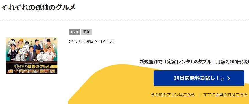 ドラマドラマ「それぞれの孤独のグルメ」は旧作で、全12話合わせてDVD4枚分なので、追加料金なしで全話視聴可能です。
