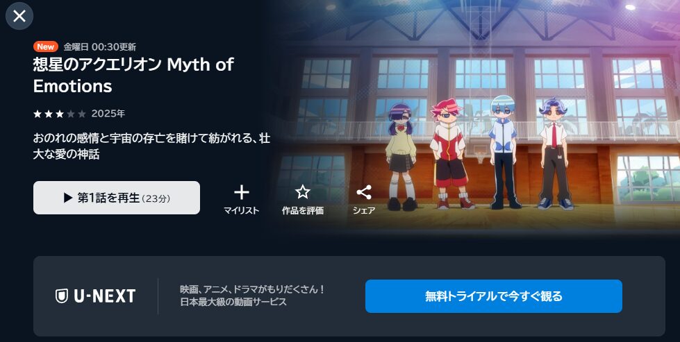 先に結論をお伝えすると、アニメ「想星のアクエリオン Myth of Emotions」は、『U-NEXT』の動画配信サイトで無料トライアル期間中に全話視聴が可能です。