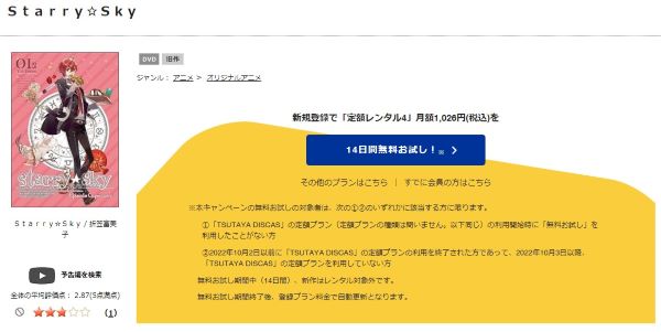 TSUTAYA DISCASは、準新作は8枚まで、話題作・旧作は枚数制限なしでお試し期間中に無料レンタルができ「Starry☆Sky」のアニメは、旧作なので無料視聴可能です。