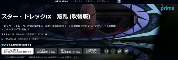 Amazonプライムビデオは、30日間のお試し無料期間があり「スター・トレック IX 叛乱」の映画をフルで視聴することができます。