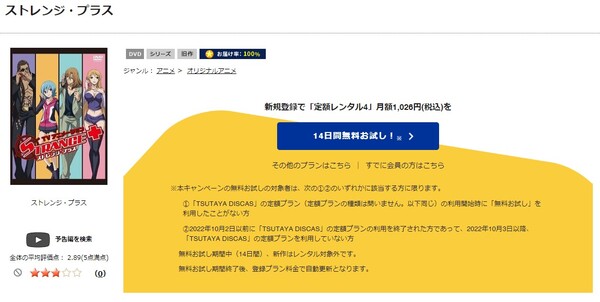 TSUTAYA DISCASは、準新作は8枚まで、話題作・旧作は枚数制限なしでお試し期間中に無料レンタルができ「ストレンジ・プラス」のアニメは、旧作なので無料視聴可能です。