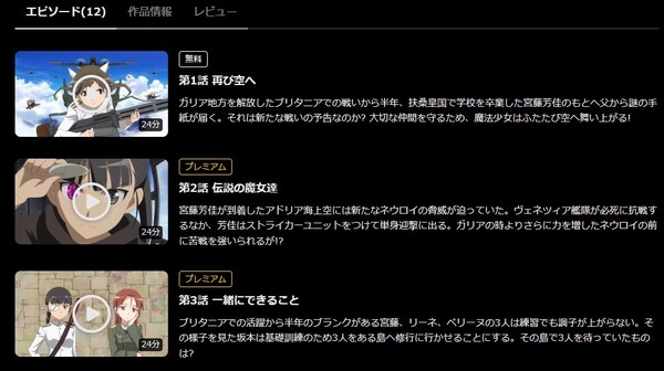 他に、「ストライクウィッチーズ2(2期)」の関連動画やシリーズ作品も見放題で配信しているので、有料になってしまいますが視聴可能です。