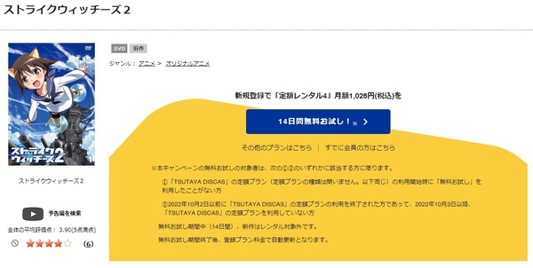 TSUTAYA DISCASは、準新作は8枚まで、話題作・旧作は枚数制限なしでお試し期間中に無料レンタルができ「ストライクウィッチーズ2(2期)」のアニメは、旧作なので無料視聴可能です。