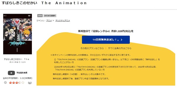 TSUTAYA DISCASは、準新作は8枚まで、話題作・旧作は枚数制限なしでお試し期間中に無料レンタルができ「すばらしきこのせかい The Animation」のアニメは、話題作なので無料視聴可能です。