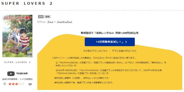 TSUTAYA DISCASは、準新作は8枚まで、話題作・旧作は枚数制限なしでお試し期間中に無料レンタルができ「SUPER LOVERS 2(2期)」のアニメは、旧作なので無料視聴可能です。