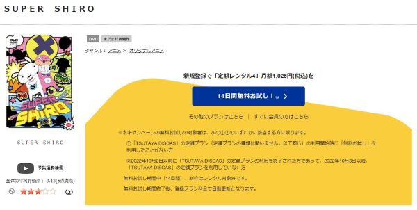 TSUTAYA DISCASは、準新作は8枚まで、話題作・旧作は枚数制限なしでお試し期間中に無料レンタルができ「SUPER SHIRO(スーパーシロ)」のアニメは、話題作なので無料視聴可能です。