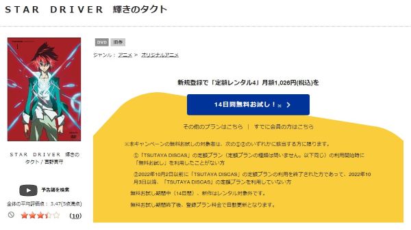 TSUTAYA DISCASは、準新作は8枚まで、話題作・旧作は枚数制限なしでお試し期間中に無料レンタルができ「STAR DRIVER 輝きのタクト」のアニメは、旧作なので無料視聴可能です。