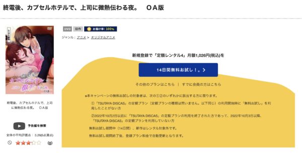 TSUTAYA DISCASは、準新作は8枚まで、話題作・旧作は枚数制限なしでお試し期間中に無料レンタルができ「終電後、カプセルホテルで、上司に微熱伝わる夜。」のアニメは、旧作なので無料視聴可能です。