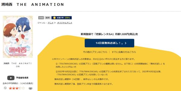 TSUTAYA DISCASは、準新作は8枚まで、話題作・旧作は枚数制限なしでお試し期間中に無料レンタルができ「洲崎西 THE ANIMATION」のアニメは、旧作なので無料視聴可能です。