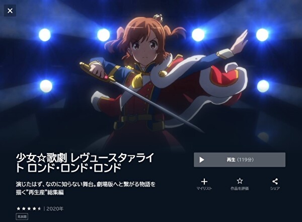 理由は、31日間の無料期間があり、「少女☆歌劇 レヴュースタァライト ロンド・ロンド・ロンド」の映画をフルで配信しているからになります。