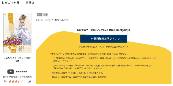 TSUTAYA DISCASは、準新作は8枚まで、話題作・旧作は枚数制限なしでお試し期間中に無料レンタルができ「しゅごキャラ!! どきっ(2期)」のアニメは、旧作なので無料視聴可能です。
