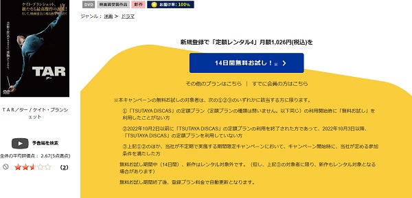 ただ、「TAR/ター」は配信しているのですが、TSUTAYA DISCASでは新作作品扱いなので、無料レンタル視聴することができません。