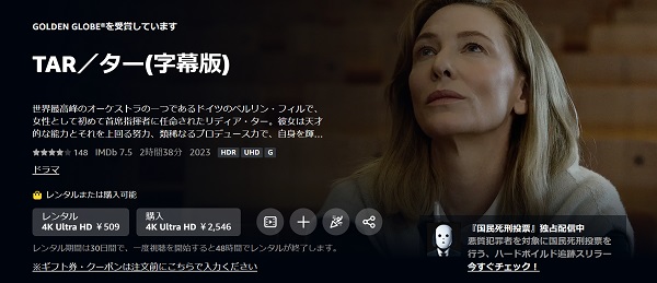 レンタルで「TAR/ター」の動画を視聴する場合は、レンタル期間もあるのでその点だけ注意してくださいね。