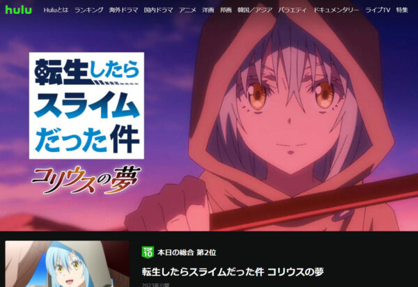 動画配信サイトHuluでは、アニメ「転生したらスライムだった件 コリウスの夢」が全話見放題で視聴ができます。