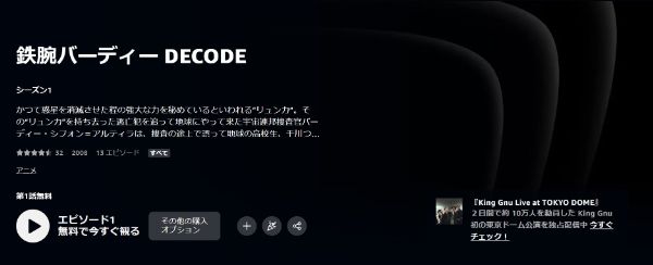 Amazonプライムはアニメ「鉄腕バーディー DECODE(第1期)」は無料で視聴できませんが、関連動画やシリーズ作品には見放題で配信されているものもあります。