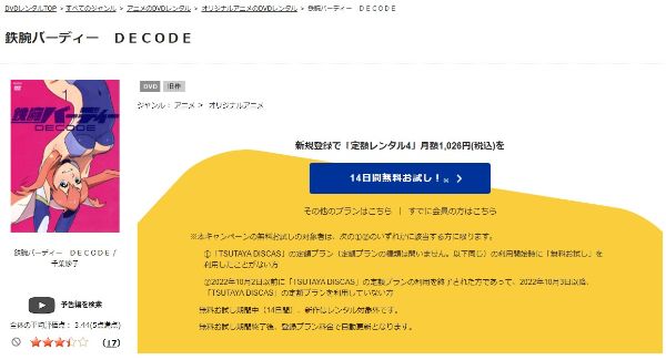TSUTAYA DISCASは、準新作は8枚まで、話題作・旧作は枚数制限なしでお試し期間中に無料レンタルができ「鉄腕バーディー DECODE(第1期)」のアニメは、旧作なので無料視聴可能です。