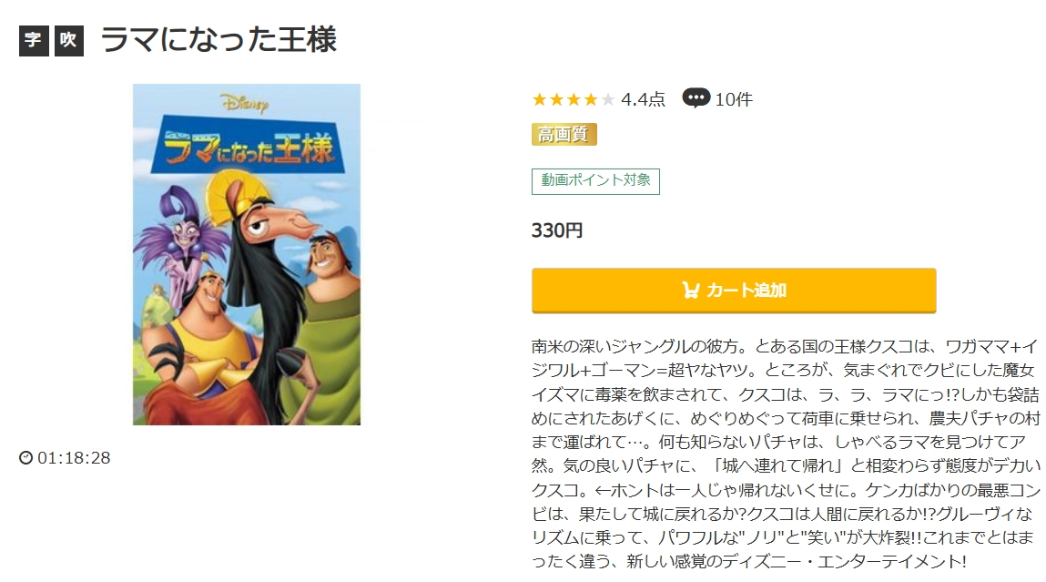 初回登録時に1,600円分のポイントがもらえるので、330ポイントでレンタル配信している映画「ラマになった王様」はフルで視聴できます。