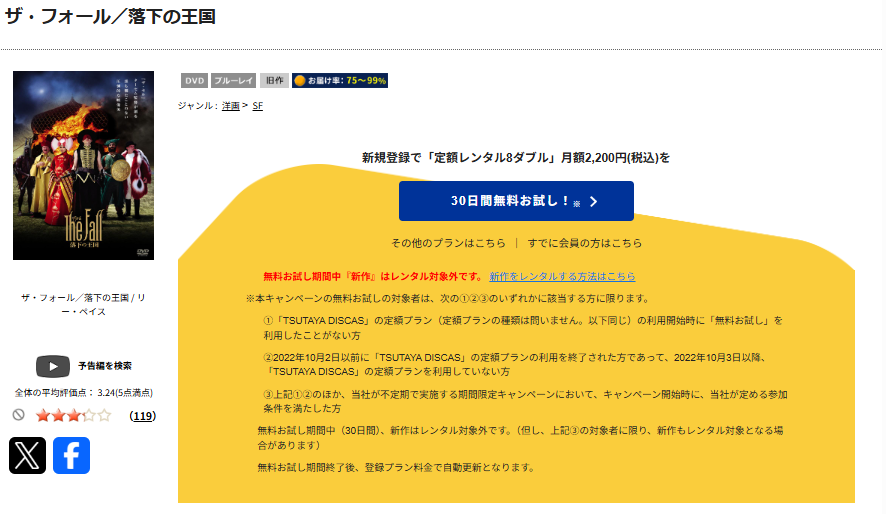 TSUTAYA DISCASは、準新作・話題作・旧作が8枚までお試し期間中に無料レンタルができ映画『落下の王国』は、旧作なので無料視聴可能です。