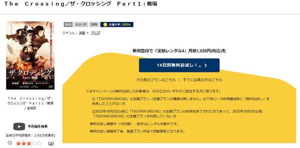 そして、映画「The Crossing ザ・クロッシングPart1:戦場」はツタヤディスカスで配信しているので、無料でDVDレンタルが可能です。