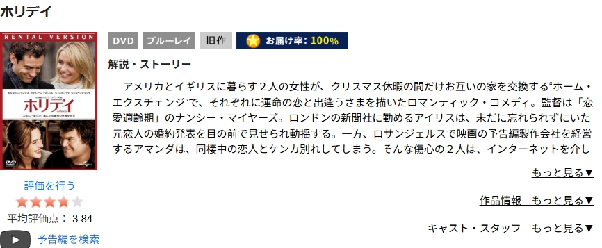 映画「ホリデイ」は旧作なので、DVDレンタルすればフル視聴が可能です。