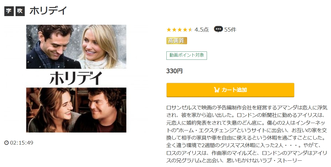 初回登録時に1,600円分のポイントがもらえるので、330ポイントでレンタル配信している映画「ホリデイ」はフルで視聴できます。