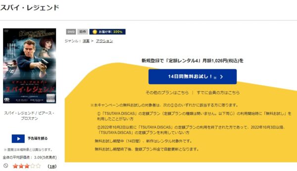 そして、映画「スパイ・レジェンド」はツタヤディスカスで配信しているので、無料でDVDレンタルが可能です。