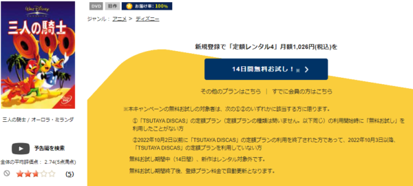 そして、映画「三人の騎士」はツタヤディスカスで配信しているので、無料でDVDレンタルが可能です。