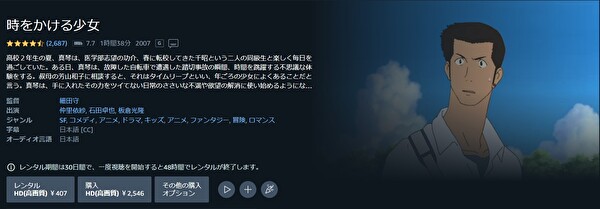 しかし、Amazonプライムビデオは無料期間が30日間ありますが、「時をかける少女」の映画はレンタル作品で407円かかってしまうため無料視聴することができません。