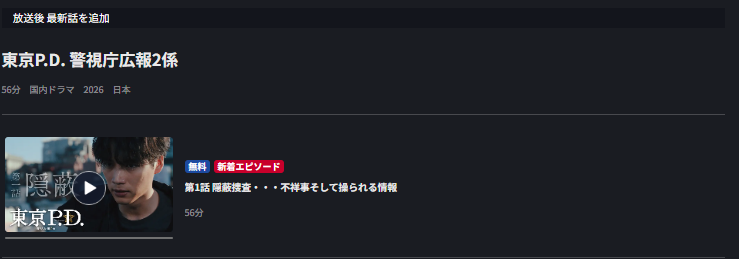 ドラマ「東京P.D. 警視庁広報2係」の最新話を無料で観たいという方は、TVerの1週間限定配信を視聴するのがおすすめです。