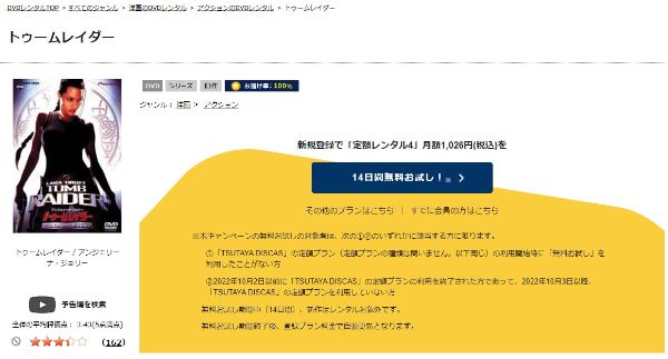 ツタヤディスカスは、準新作・話題作・旧作が4枚までなら、無料お試し期間中にレンタルができるので、「トゥームレイダー」の映画を無料で視聴した後も14日間以内なら他のシリーズ作品や見たかった映画も無料でレンタルすることができますよ。