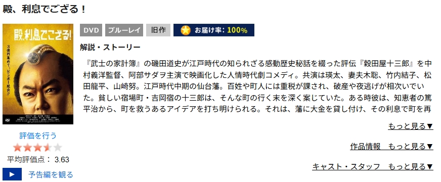 このDVDレンタルサービスを使うことで、DVDを自宅に取り寄せて、映画「殿、利息でござる!」を視聴可能です。