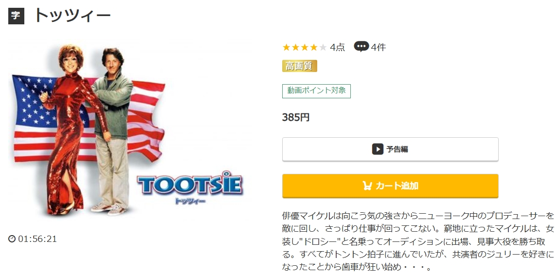 初回登録時に1,600円分のポイントがもらえるので、385ポイントでレンタル配信している映画「トッツィー」はフルで視聴できます。