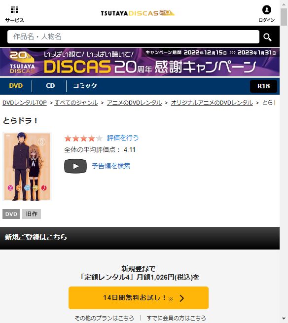 TSUTAYA DISCASは、新作を除くDVDを8枚までお試し期間中に無料レンタルができ「とらドラ!」のアニメは、旧作なので無料視聴可能です。