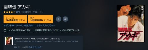 人気の動画配信サービスのAmazonプライムビデオで映画「闘牌伝アカギ」の映画がフルで視聴できるか調査しました。