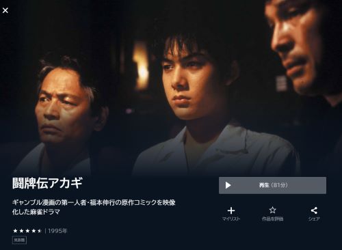 ただ、映画「闘牌伝アカギ」の関連作品の映画は配信しているので、見放題で視聴は可能です。