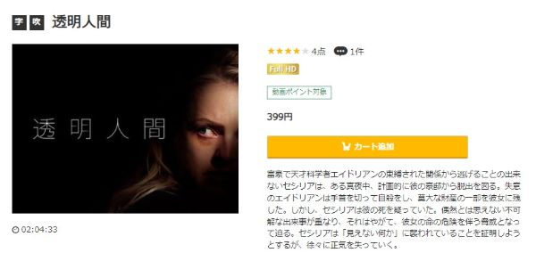 music.jpは、初回登録で1,600Ptが貰えるので「透明人間(2020)」の映画を無料で見ることができます。