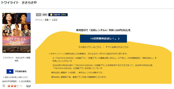 ツタヤディスカスは、準新作・話題作・旧作が4枚までなら、無料お試し期間中にレンタルができるので、「トワイライト ささらさや」の映画を無料で視聴した後も14日間以内なら他のシリーズ作品や見たかった映画も無料でレンタルすることができますよ。