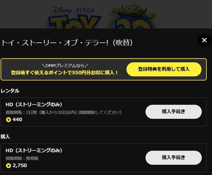 『DMM TV』は初回登録限定で無料お試し期間がある他、550円分のDMMポイント付与されるため、440ポイントでレンタル可能な映画「トイ・ストーリー・オブ・テラー!」を実質無料でフル視聴できますよ。