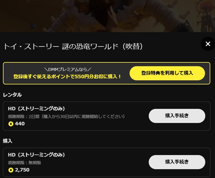 DMM TVなら、初回登録後すぐにもらえる550円分のポイントを活用すれば、440ポイントでレンタル可能な映画「トイ・ストーリー 謎の恐竜ワールド」を、実質無料で視聴可能です。