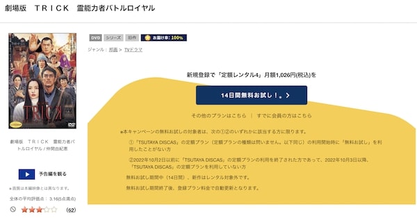 そして、映画「劇場版TRICK 霊能力者バトルロイヤル」はツタヤディスカスで配信しているので、無料でDVDレンタルが可能です。