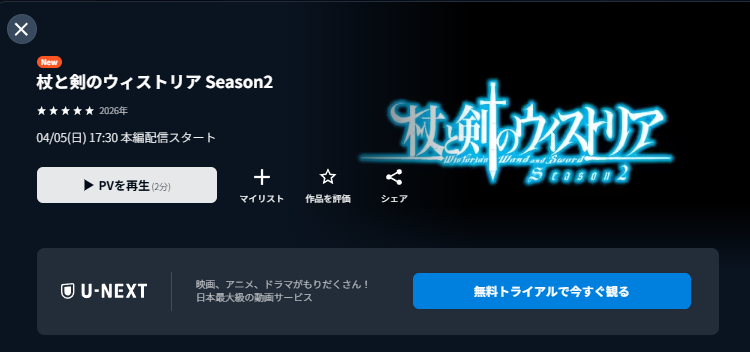 先に結論をお伝えすると、アニメ「杖と剣のウィストリア 2期」は動画配信サービス『U-NEXT』で配信予定です。