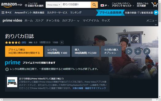 Amazonプライムビデオは、30日間のお試し無料期間があり「釣りバカ日誌1」の映画をフルで視聴することができます。