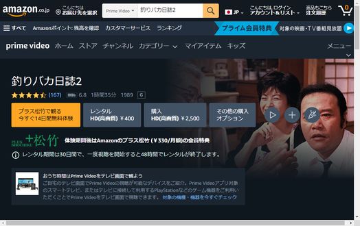 人気の動画配信サービスのAmazonプライムビデオで映画「釣りバカ日誌2」の映画がフルで視聴できるか調査しました。
