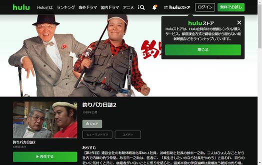 映画「釣りバカ日誌2」の動画はHuluで配信しており見放題で視聴できます。