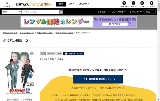 そして、映画「釣りバカ日誌2」はツタヤディスカスで配信しているので、無料でDVDレンタルが可能です。
