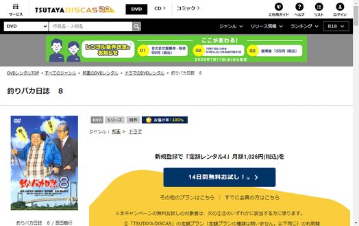 そして、映画「釣りバカ日誌8」はツタヤディスカスで配信しているので、無料でDVDレンタルが可能です。