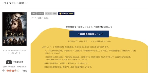 ツタヤディスカスは、準新作・話題作・旧作が4枚までなら、無料お試し期間中にレンタルができるので、「トワイライト〜初恋〜」の映画を無料で視聴した後も14日間以内なら他のシリーズ作品や見たかった映画も無料でレンタルすることができますよ。