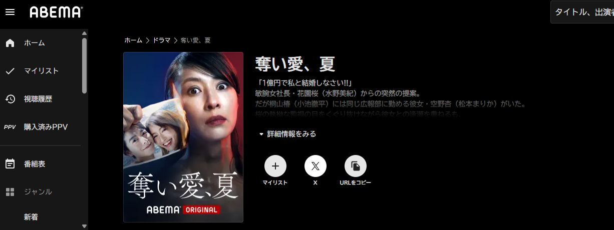 先に結論をお伝えすると、ドラマ「奪い愛、夏」は、動画配信サイトの『ABEMAプレミアム』にて全話視聴可能です。