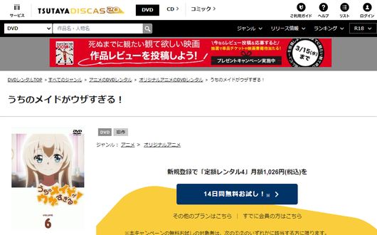 TSUTAYA DISCASは、準新作は8枚まで、話題作・旧作は枚数制限なしでお試し期間中に無料レンタルができ「うちのメイドがウザすぎる!」のアニメは、旧作なので無料視聴可能です。