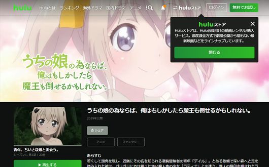 そして、アニメ「うちの娘の為ならば、俺はもしかしたら魔王も倒せるかもしれない。」の関連作品もHuluで配信中で見放題で視聴できます。